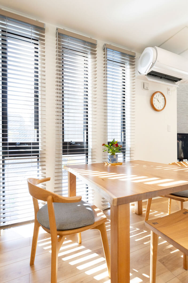 2階の東南の角に配置されたダイニング。外観のアクセントにもなる3連の縦長窓で、朝食から明るい空間に。