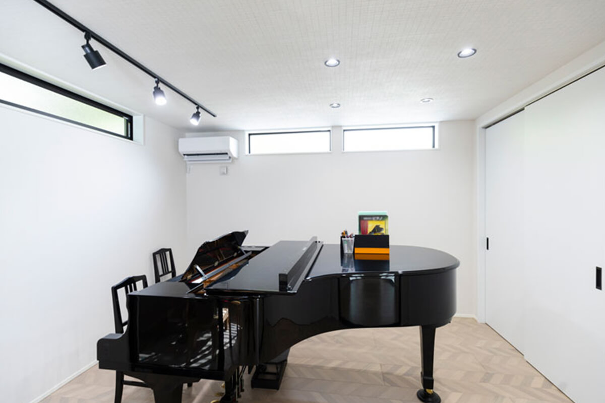 40年前にご両親が建てられた家の1室でピアノ教室をされていたというMさま。土地を相続したことをきっかけに、思い切って建て替えをされることになりました。Mさまのご希望は、「ピアノ教室用に待合スペース付きの防音室」「プライベートスペースには高窓を」など。設計担当者が現地まで足を運び、近隣の建物の状況や日当りなどを確認。営業・設計・コーディネイターがアイデアを出し合いながら、Mさまのご希望を盛り込んだ、素敵な家を建てさせていただくことができました。