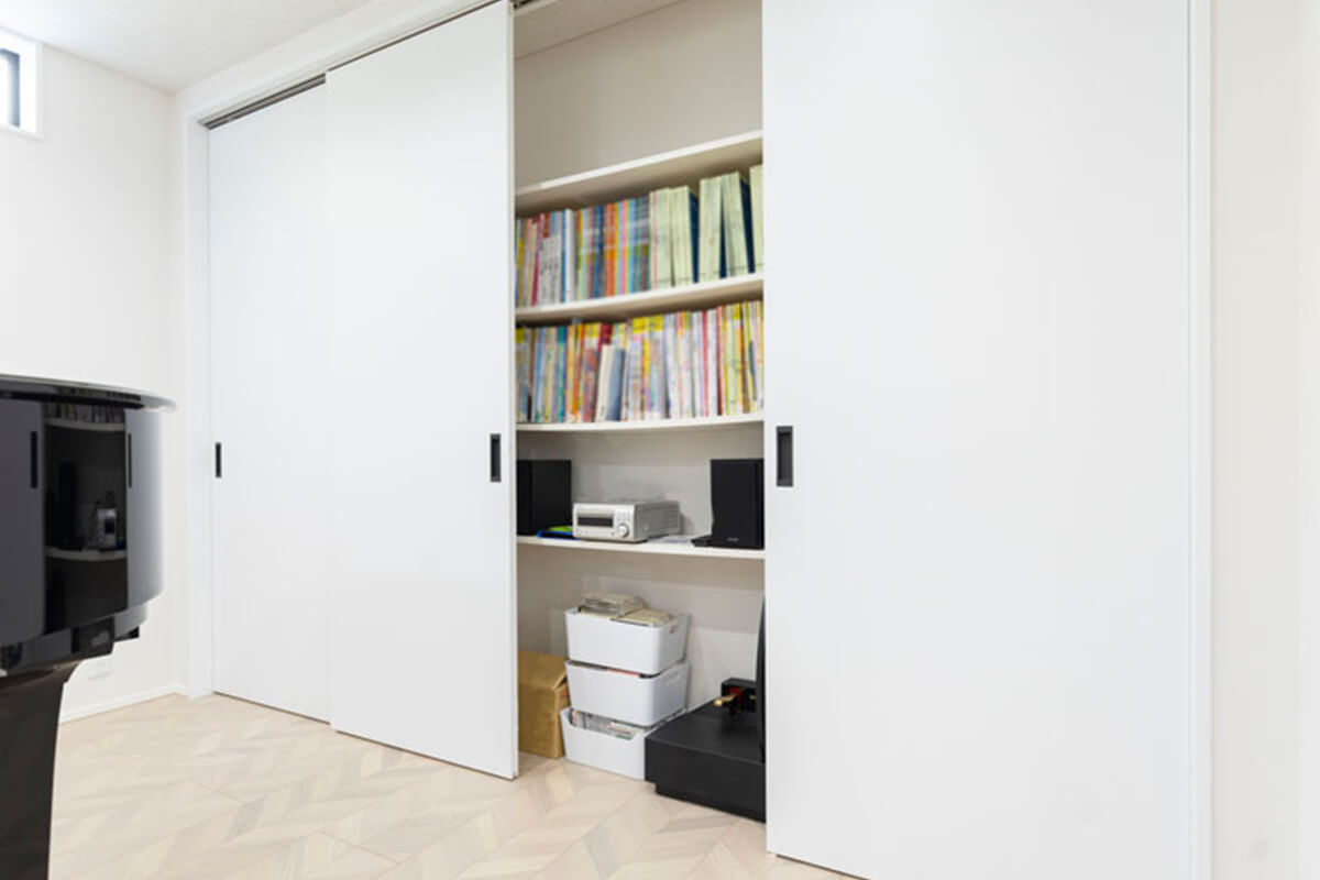 楽譜やオーディオ設備を収めることができるサイズに奥行や高さを合わせた収納棚