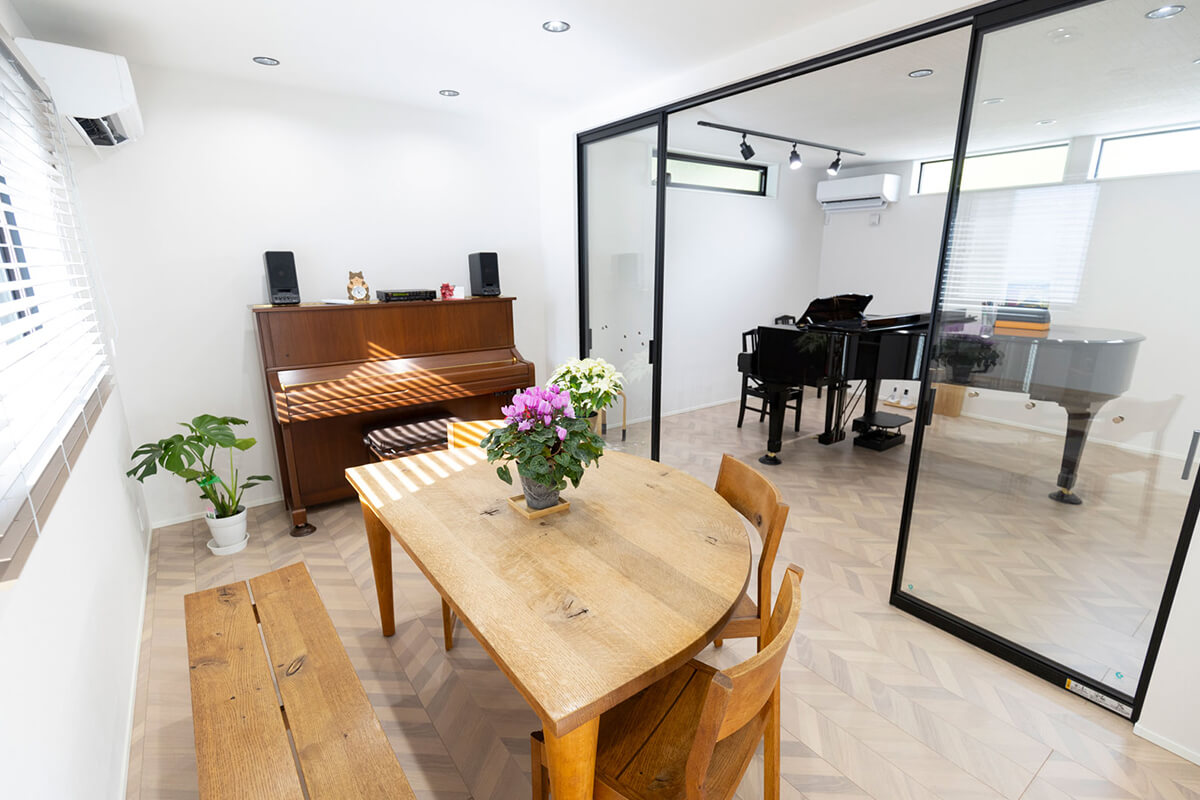 ピアノ室と待合スペースの間には、ハイドアのガラス扉を設置。