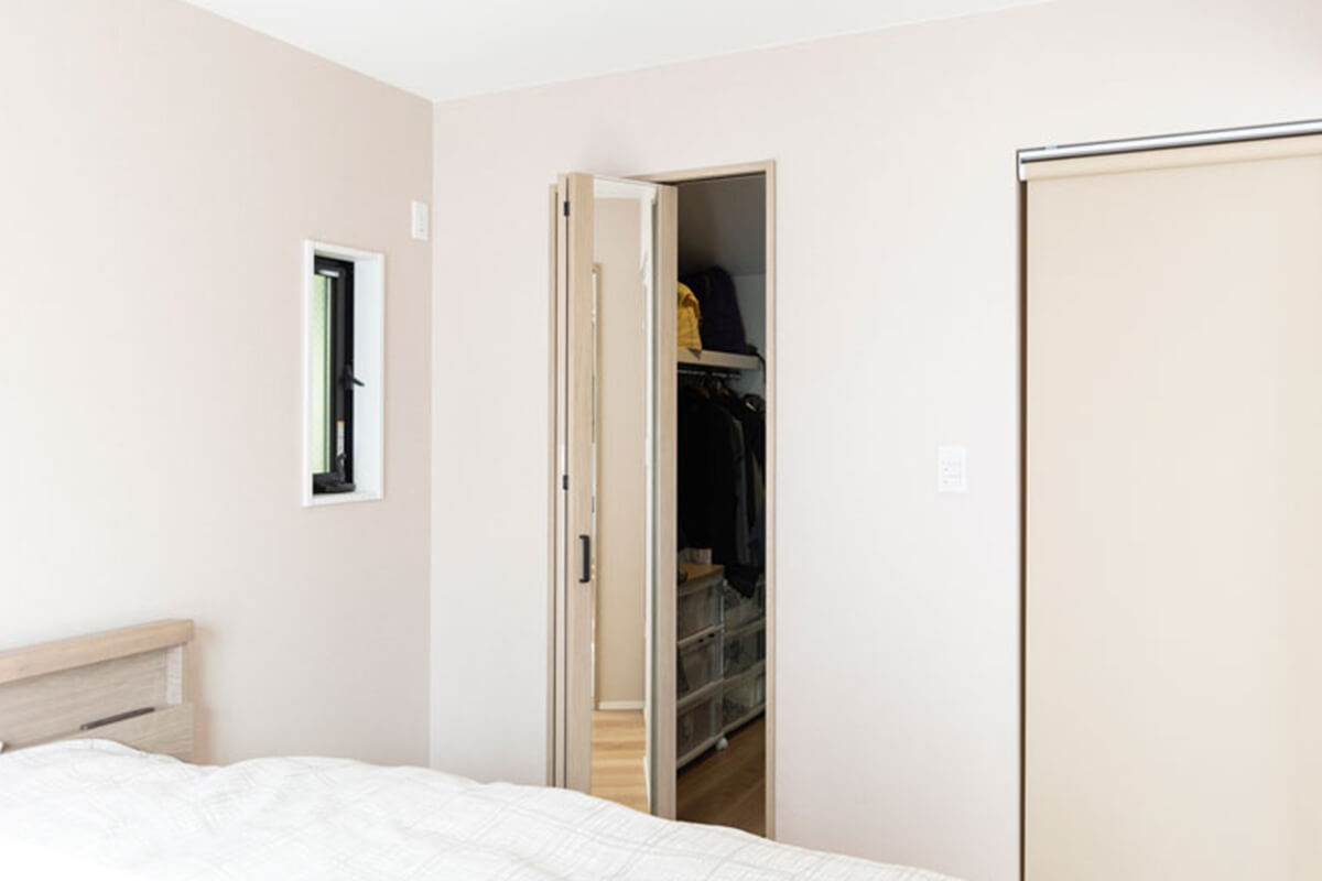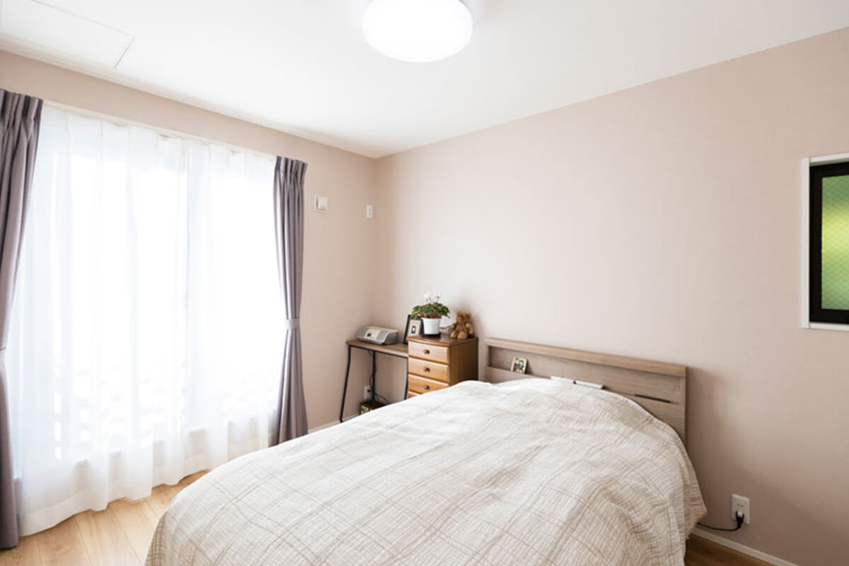 ほんのりと淡い暖色で仕上げた主寝室。他の部屋と比べて暖かみのあるインテリアに。