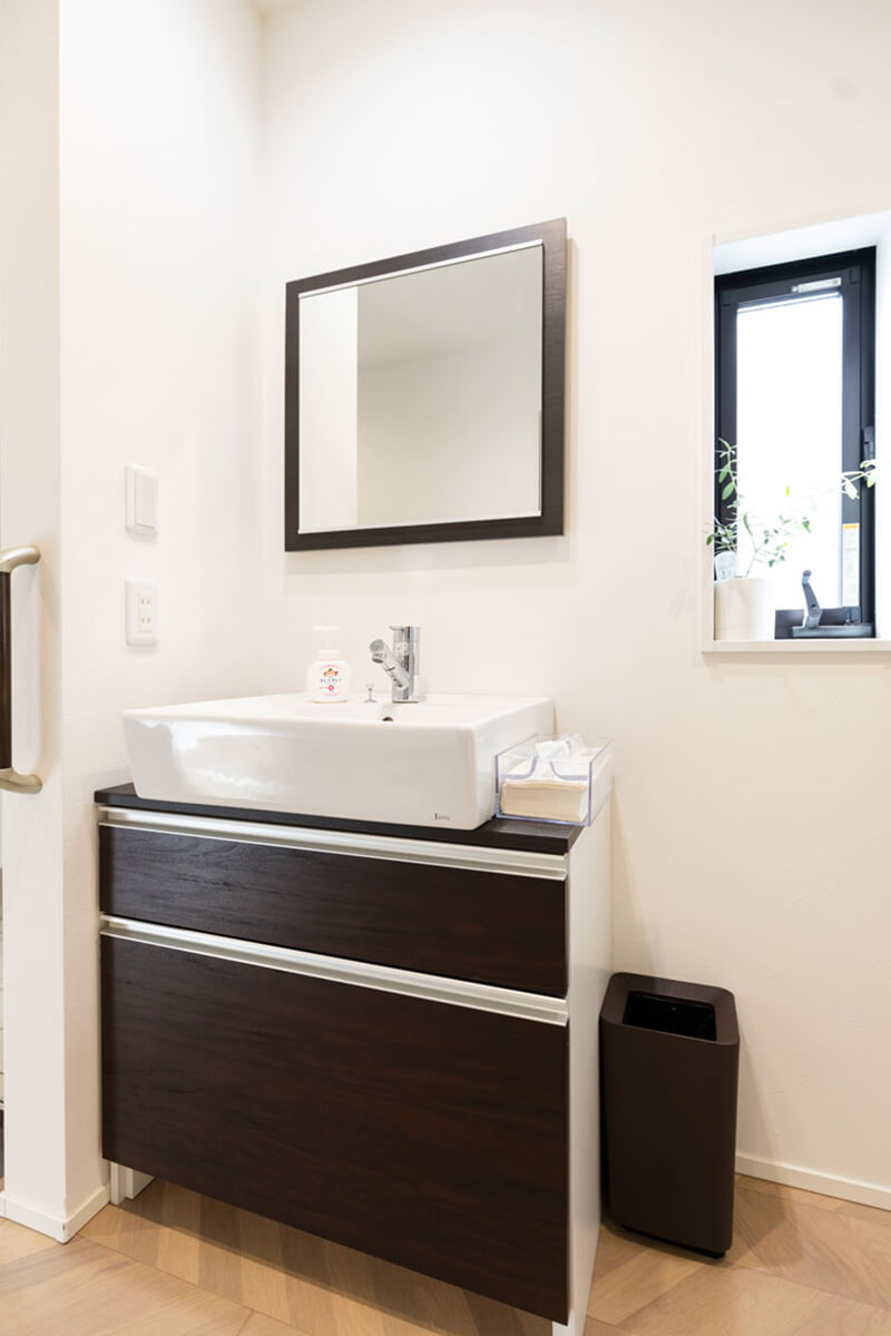 玄関横にはピアノ教室の生徒や来客が利用できるコンパクトな洗面化粧台。