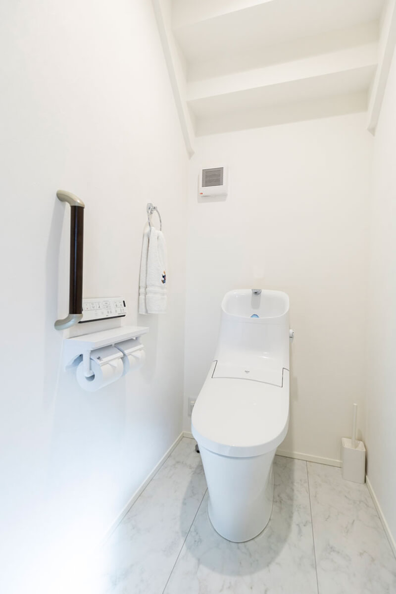 ピアノ教室の生徒さんも使われる1Fのお手洗いは、階段下のスペースを有効活用。