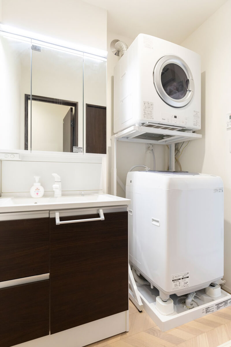 乾燥機も設置し、立体的にも余すことなく設計された充実の洗面室。