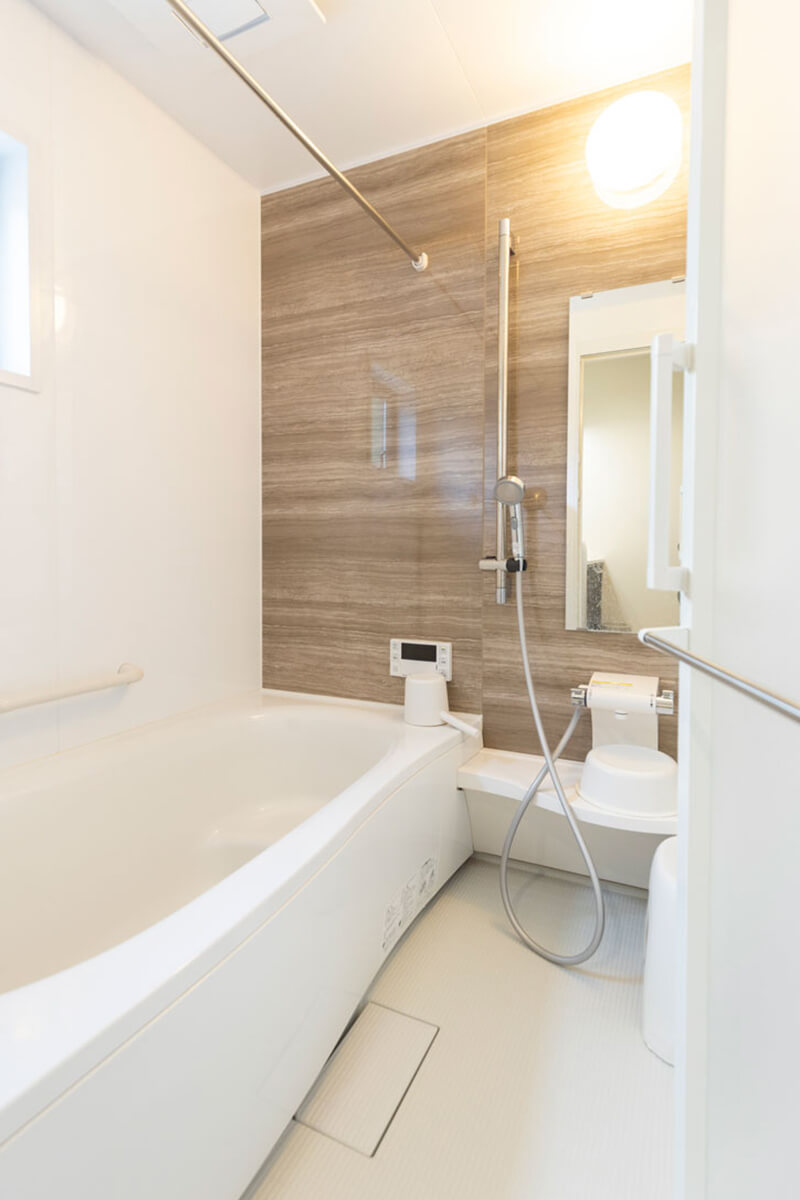 木目をアクセントに用いた足を伸ばしてリラックスできる浴室。外からの視線も考え小さめの高窓を採用。