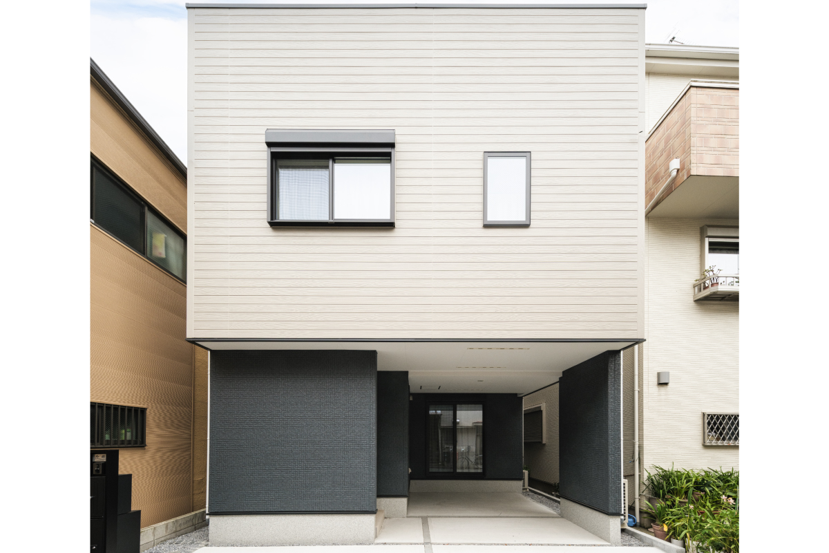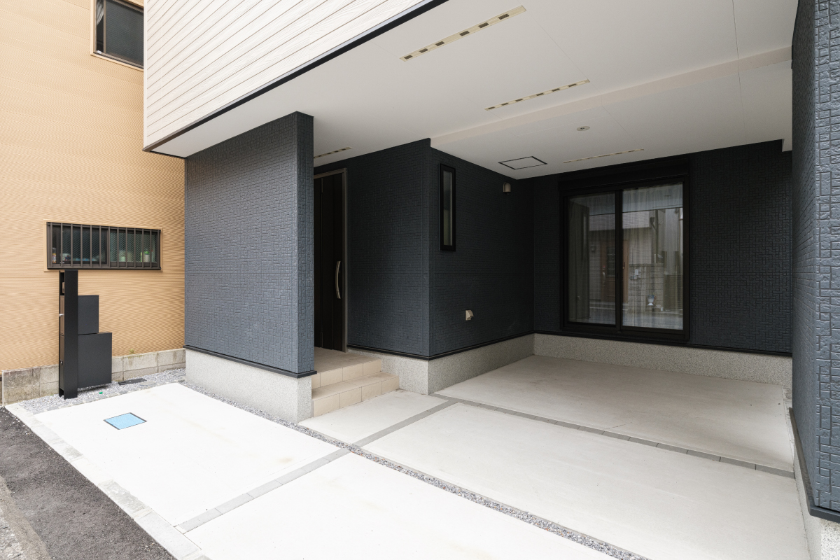 ガレージはミニバンを駐車できるよう、ゆとりのある広さを確保。1階部分の外壁には立体感のある凹凸模様を施し、こだわりの黒を採用。