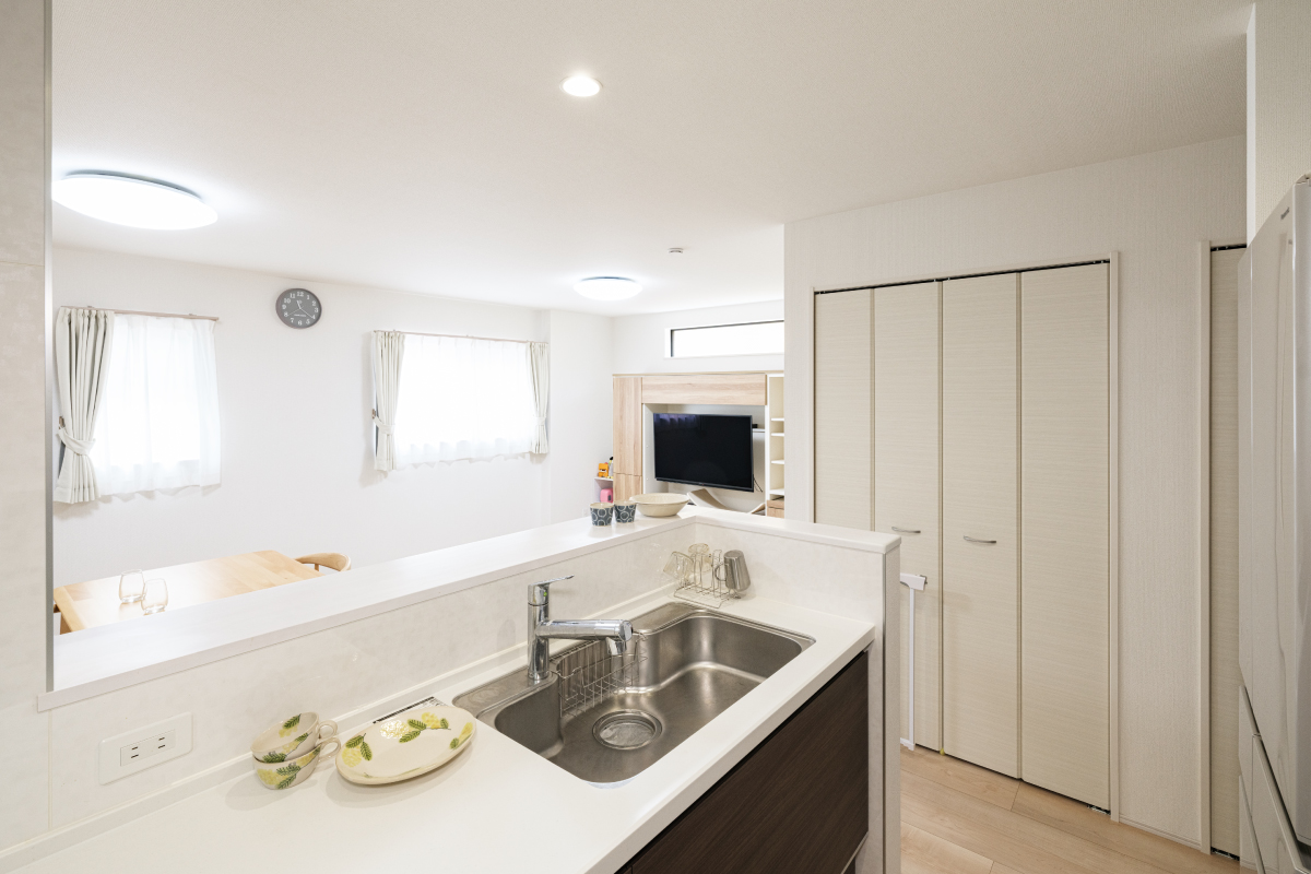 家族の顔を見ながら調理作業ができるキッチンは、会話の弾む空間に。写真中央の茶色のドアは、洗面室へのスムーズな動線を確保しています。
