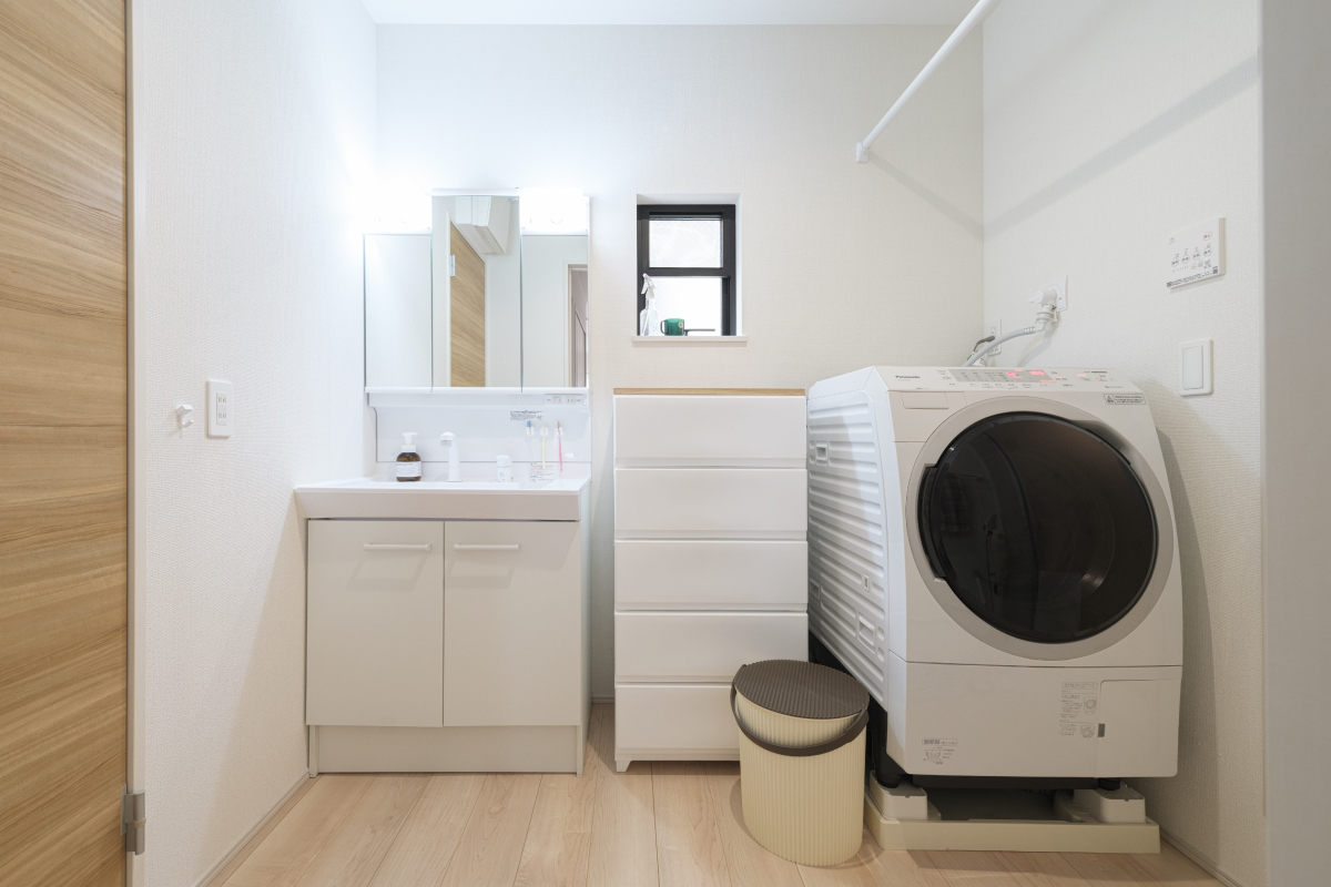 洗面室にはドラム式洗濯機を設置し、一部の洗濯物をその場で干せるよう工夫。一連の洗濯作業を洗面室内で完結できるため、家事効率がぐんとアップします。