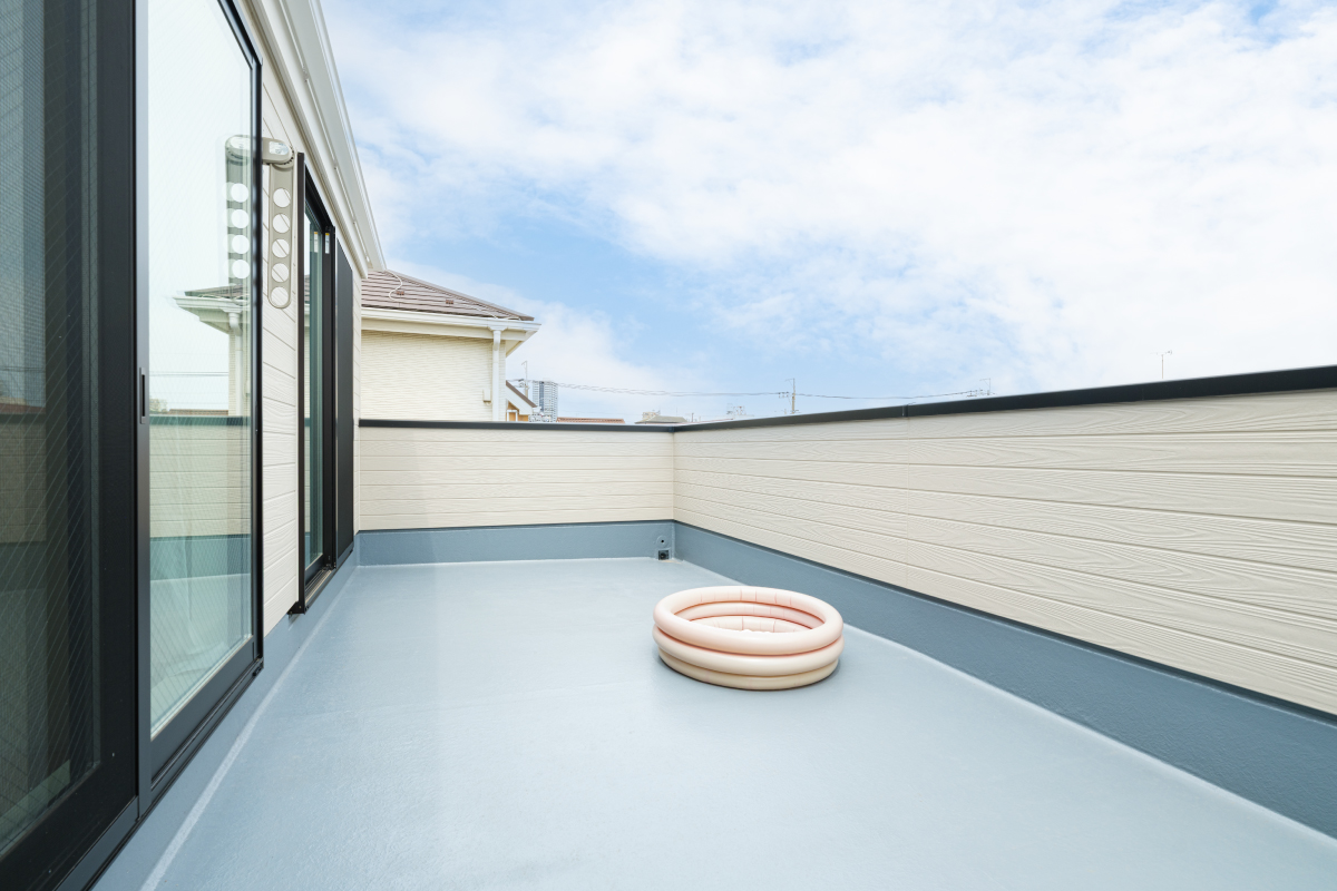 9.6帖ほどの広さのルーフバルコニーは視界が開け、開放的。夏にはビニールプールを置いて水遊びができるように水栓金具も設置。