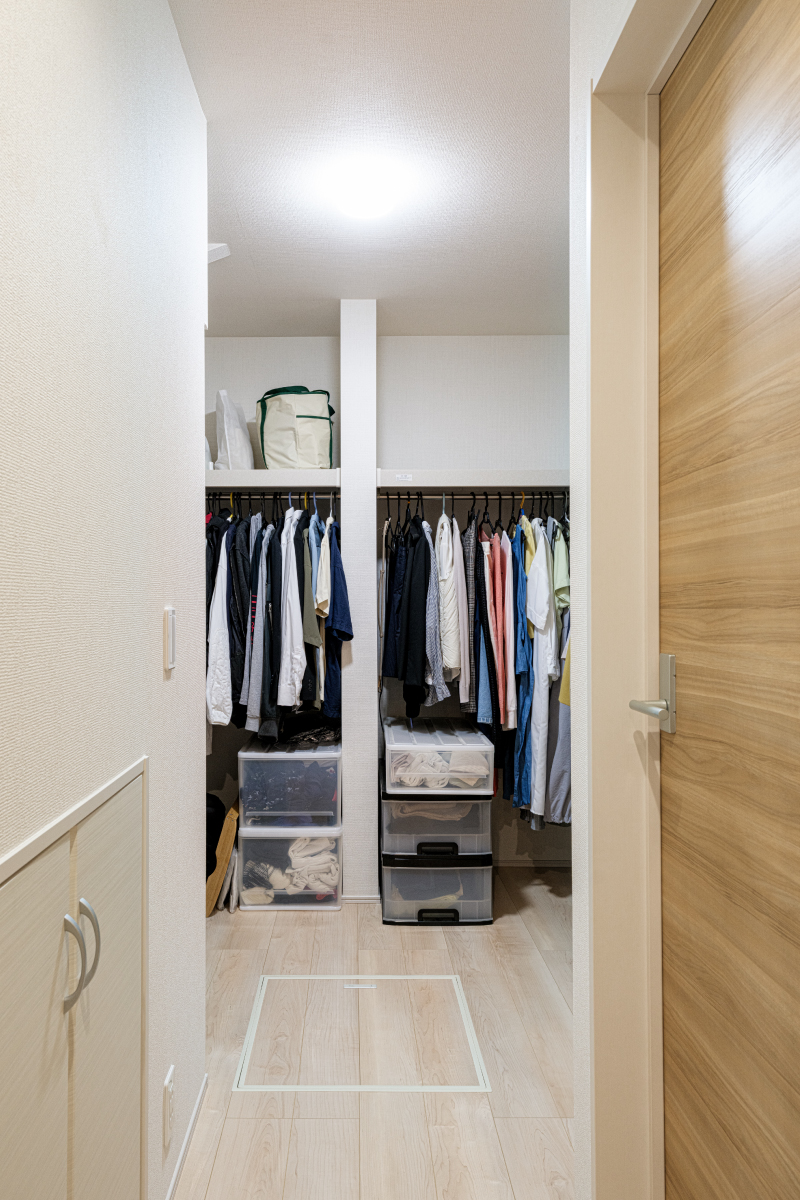 寝室の隣にウォークインクローゼットを設け、家族の衣類を一カ所で管理