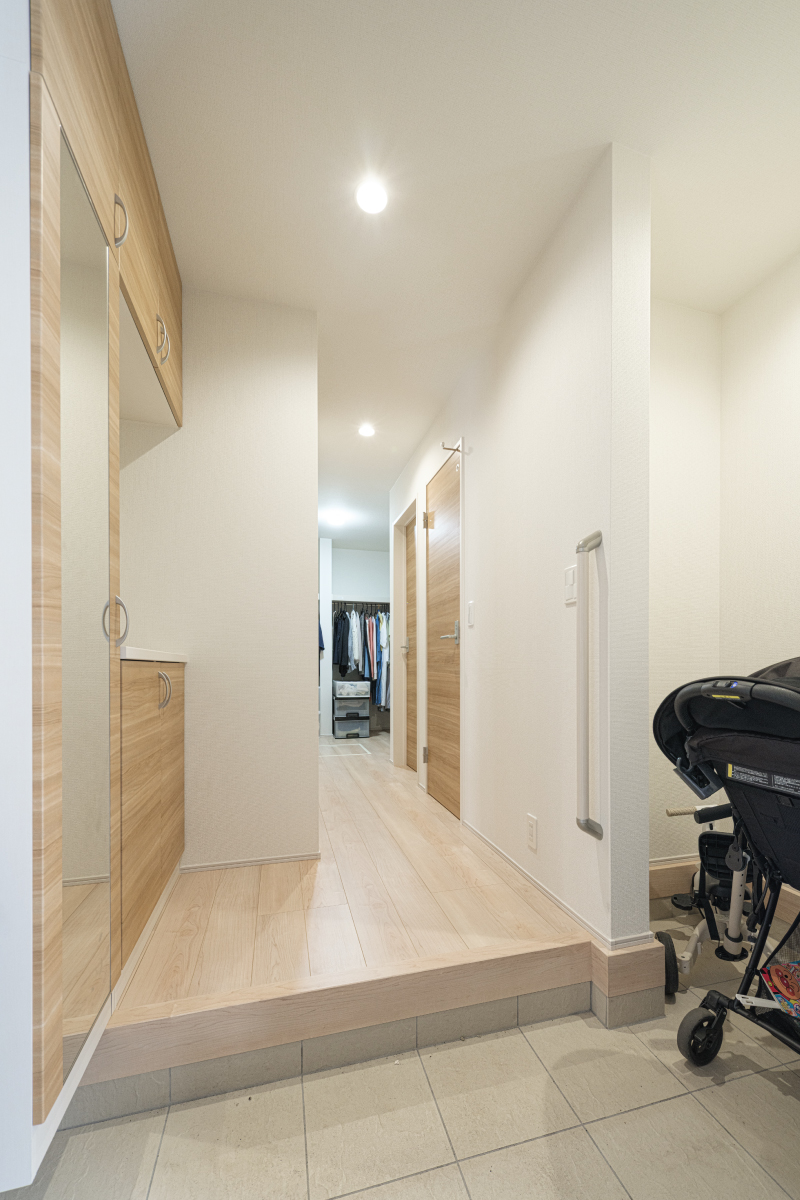 玄関には靴をしまう収納のほかに、シューズインクロークを確保。現在は、ベビーカーを置くスペースとして利用されています。