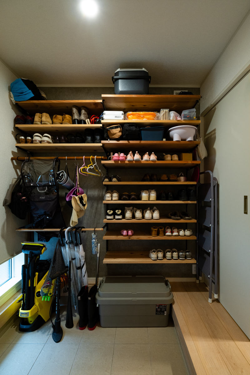 シューズインクロークは扉を設けず、オープンタイプにしました。靴だけでなく、帽子や傘などの外出時に必要なアイテムを一箇所にまとめて収納できるようにしています。