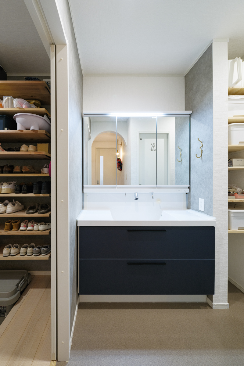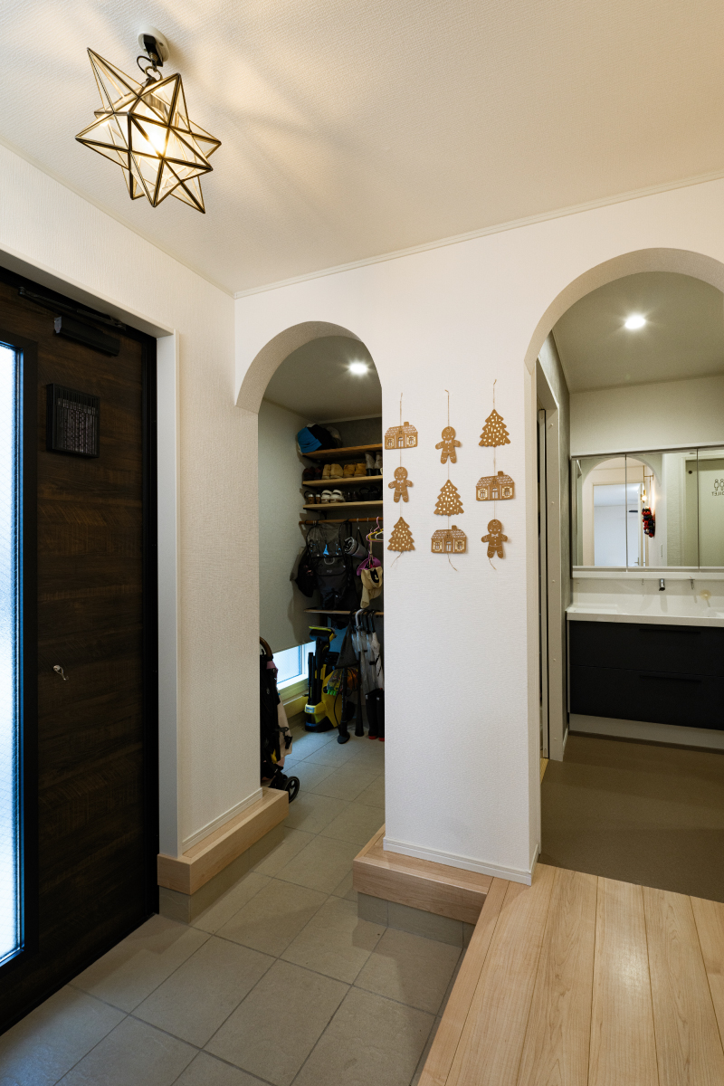 シューズインクロークと洗面室の入り口にはアーチ状のデザインを採用しました。また、照明にもこだわり、玄関には拡散する光が空間を美しく彩る星形の照明を選びました。