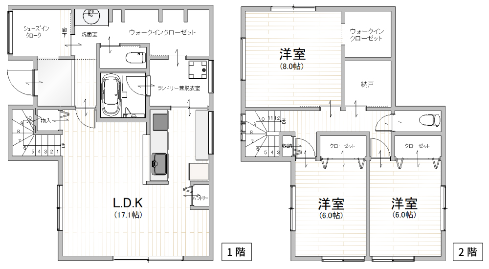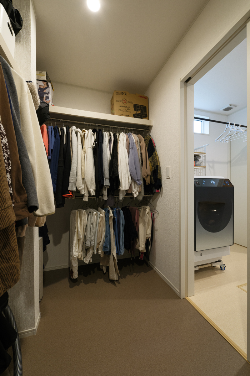 1階には大型のウォークインクローゼットを設置しました。ランドリールームを経由してLDKへとつながる動線を確保し、行き止まりのない設計になっています。