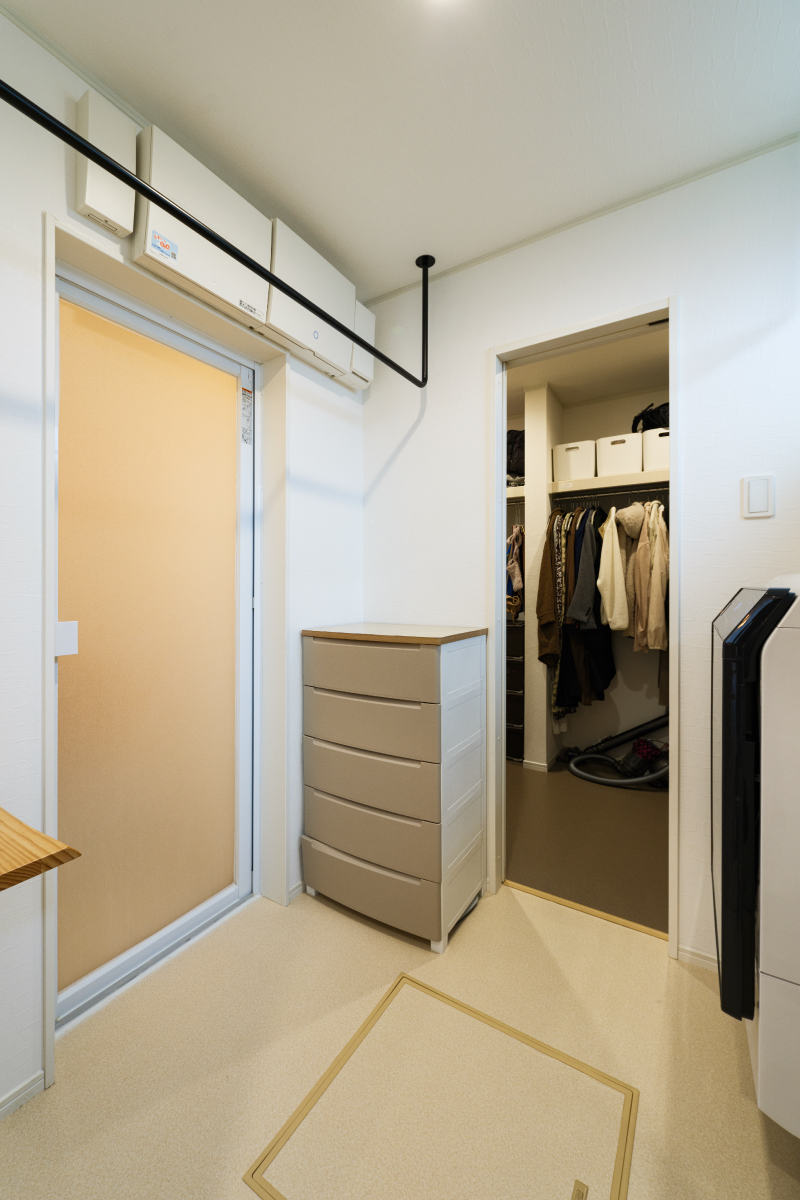 ランドリールームは脱衣室としても兼用しています。洗濯物を干せるように、アイアンバーを設置しました。