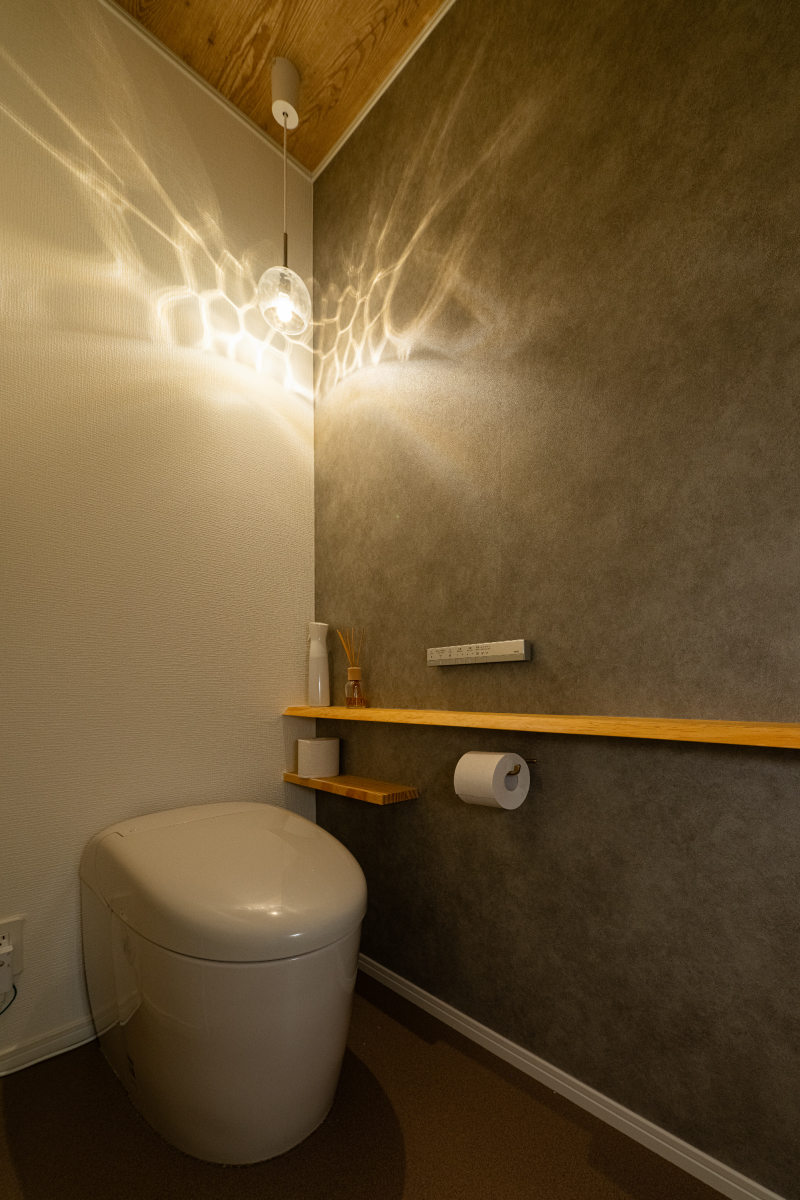 トイレはタンクレス仕様を採用しました。シックなアクセントクロスを採用し、上品で落ち着いた空間を演出しました。