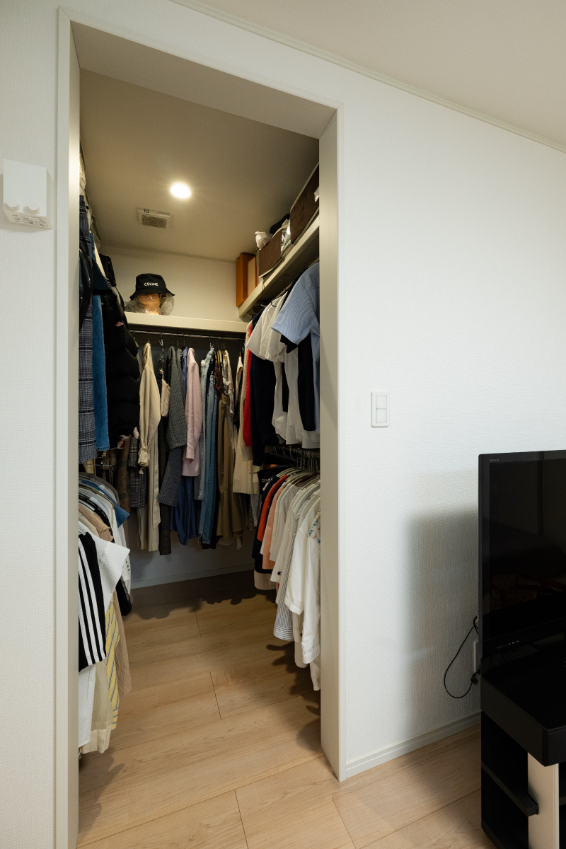 2階の主寝室には、ウォークインクローゼットを設けました。コートなどの丈の長い衣類も収納できるよう、ハンガーパイプの取り付け位置を工夫し、使い勝手を向上させています。