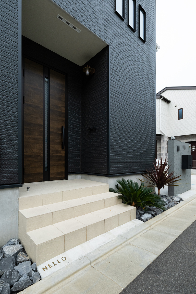 外構にも細やかな配慮を施し、こだわりの照明を設置して植栽を取り入れました。また、T様のアイデアにより階段の最下段に埋め込まれた「HELLO」の文字が、お客様を温かくお迎えします。