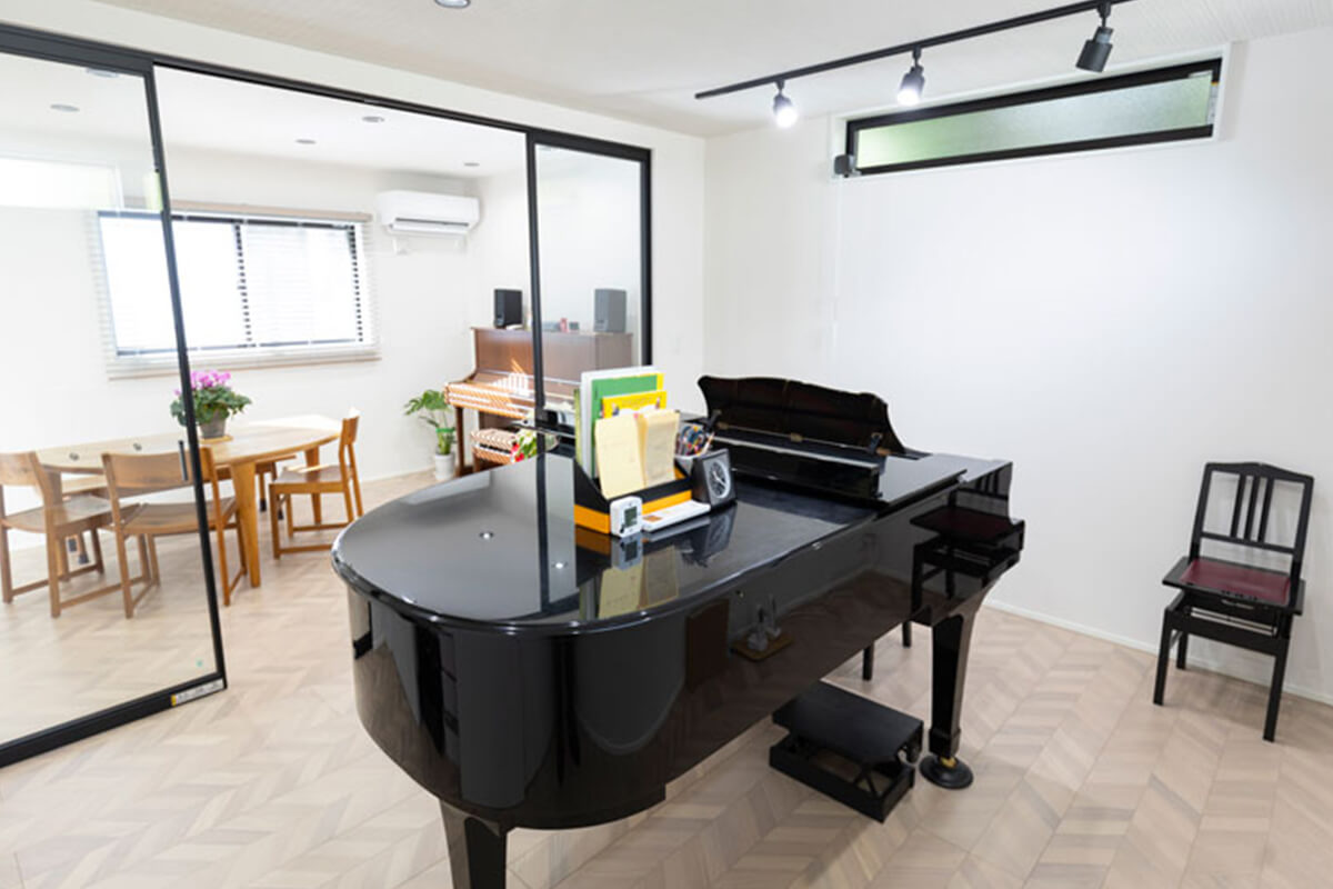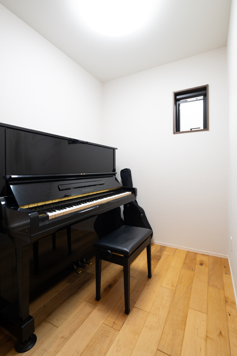 1階には趣味のピアノやギターを演奏できる部屋を設けました。最近ではお子様と一緒にピアノを弾くこともあるそうです。