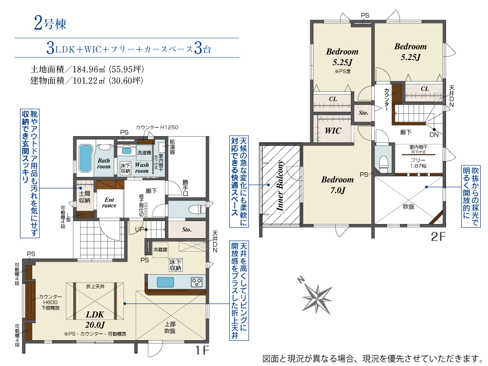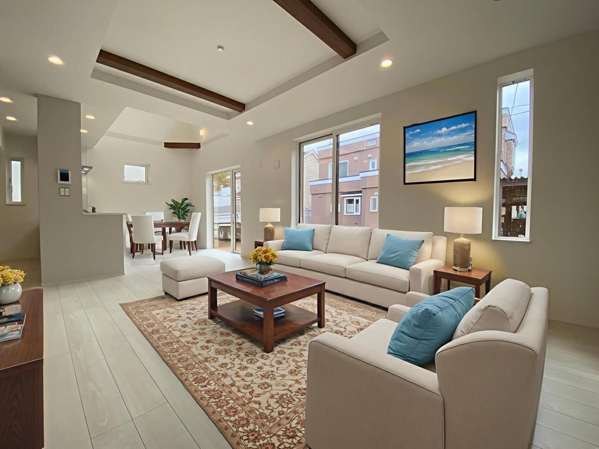 - LDK15帖以上、フローリング、バルコニー、全室2面採光、吹き抜け
