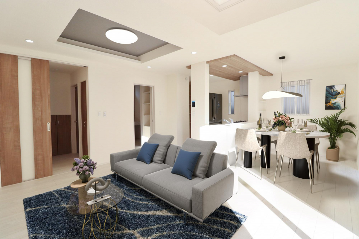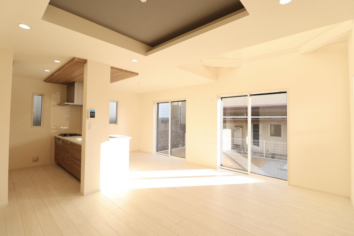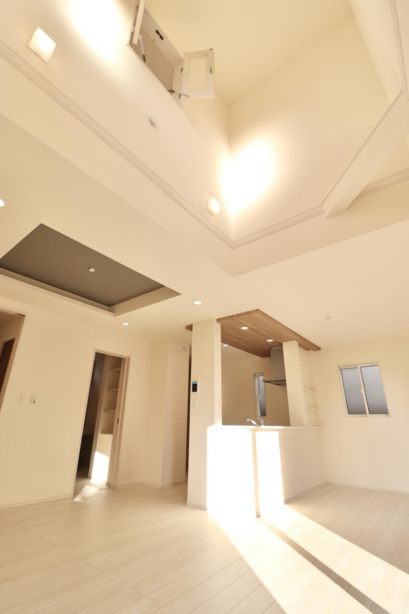・開放感あふれる折上天井、リビング吹抜