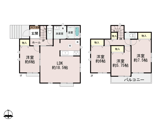 ◎1階LDK約18.5帖と洋室6帖、2階3部屋の4LDK、主寝室は7.5帖!