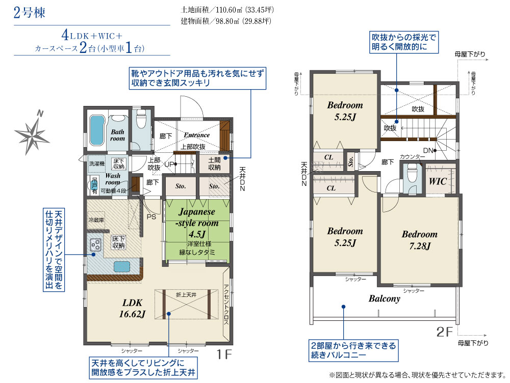 ご夫婦それぞれの車利用はもちろん、来客時にも対応できるゆとりのある住まいです。(2)2階洋室にWIC完備の充実収納プラン