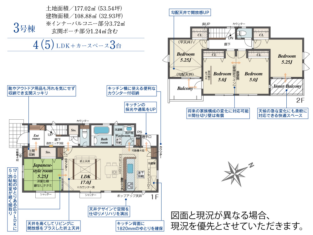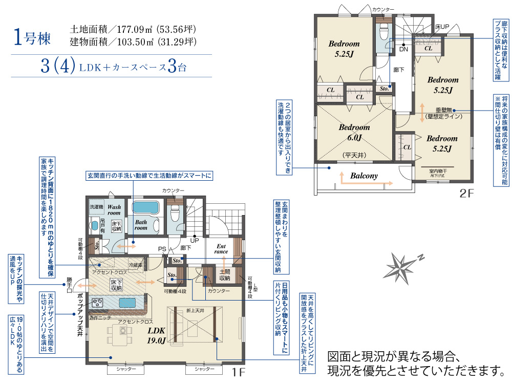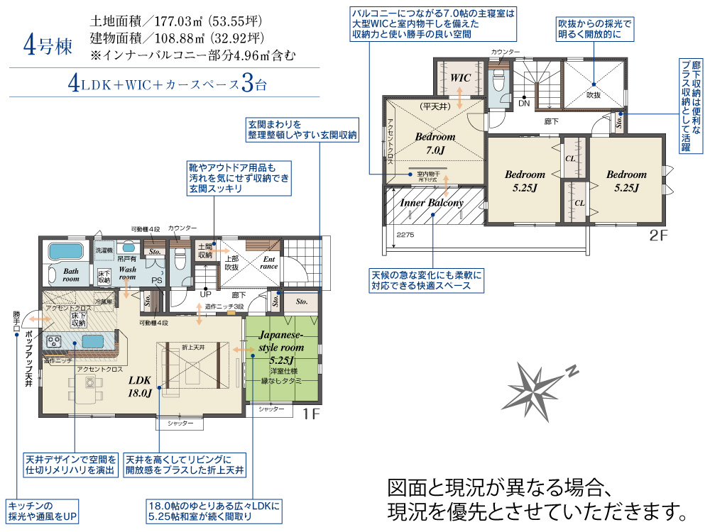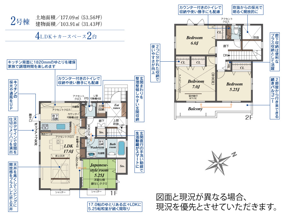 2階は4室プラン対応可能。ライフスタイルに合わせて、家族みんなが心地よく過ごせる“ゆとりある住まい”を実現。 *2号棟* 【玄関吹抜】吹き抜けから光が差し込む、開放感あふれる明るい玄関がお出迎え。