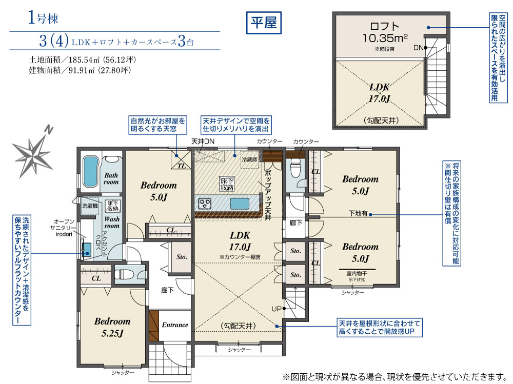 ロフトやリビング・廊下などに収納スペースを設計