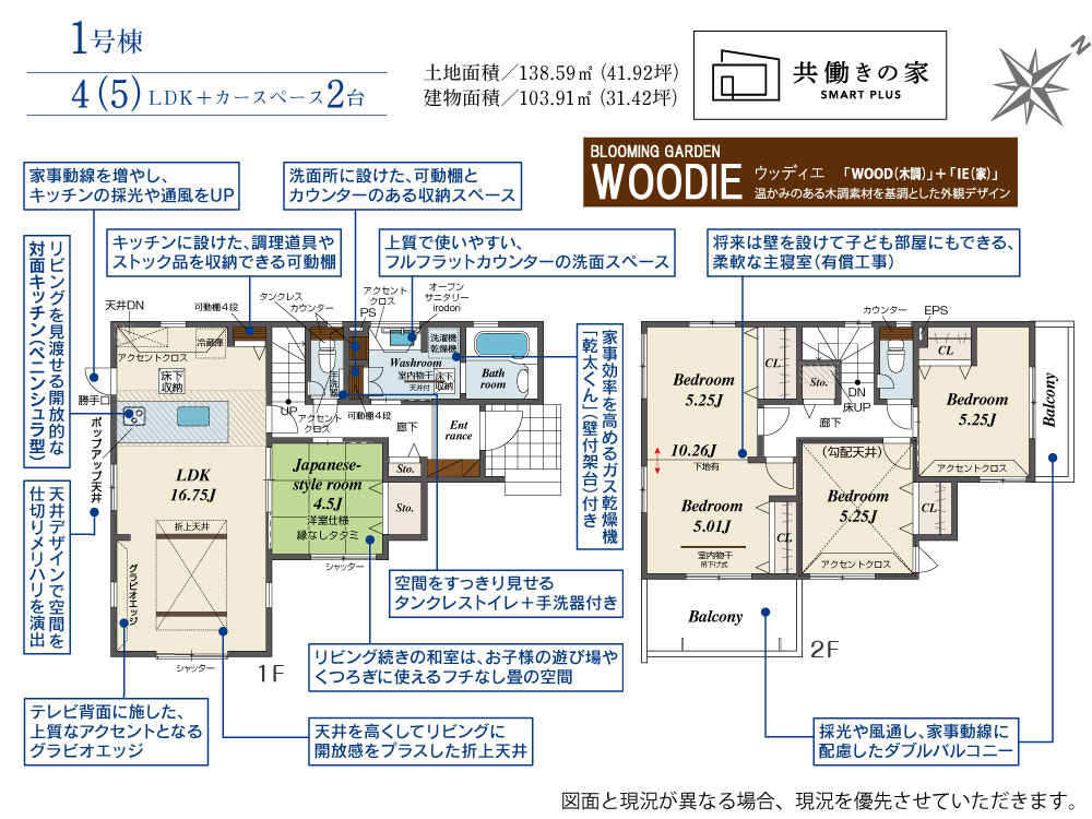 FOODOFFストッカー 徒歩11分 ほか間取りのポイント■ 1号棟・リビングに隣接したフチなし畳スペースを設置■2号棟・玄関横に来客対応にも便利な5.0帖のフチなし畳の洋室を配置住宅設備のポイント