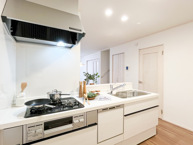 ○システムキッチン(食洗機付き)は人気の対面式を採用、ご家族と会話をしながら、お料理を楽しめます。