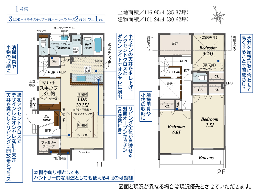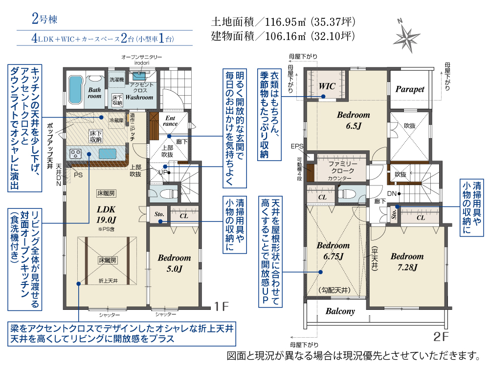 全棟敷地面積115平方メートル超え!駐車場2台分確保でゆとりある暮らし広くておしゃれな洗面化粧台、空間を美しく演出する吹抜や折上天井など、