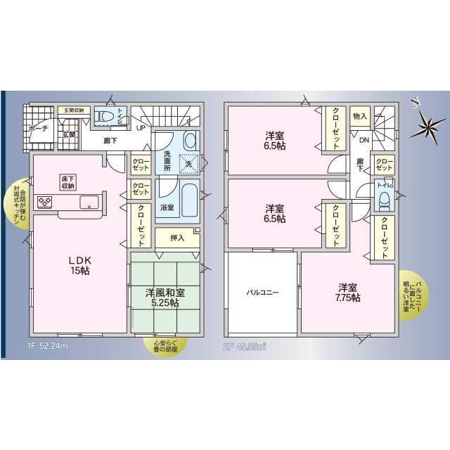 - LDK15帖以上、フローリング、和室付、バルコニー、ルーフバルコニー、全室2面採光