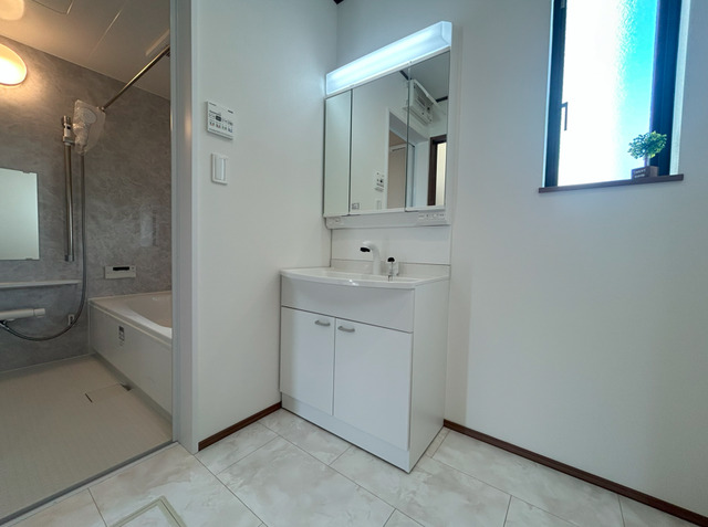 洗面所の写真です♪女性に嬉しい3面鏡化粧台♪鏡の裏は収納スペースになっており、小型のドライヤーや化粧品等収納できます♪水はねを抑えるボウルで、節水を実現した洗面台です♪