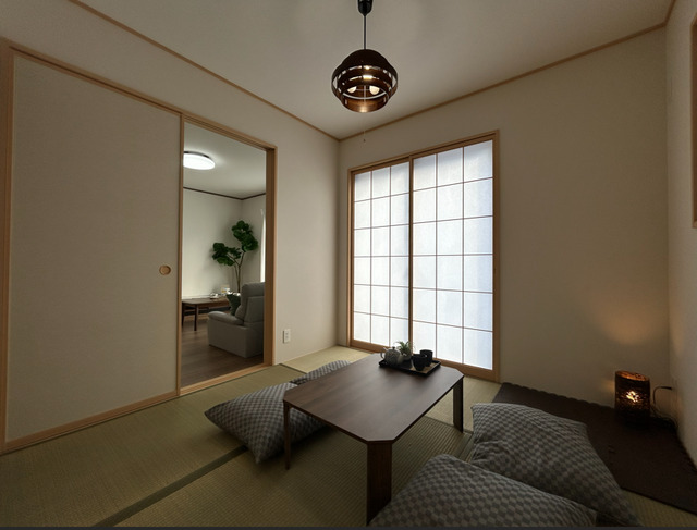 - 照明器具、システムキッチン、カウンターキッチン、洗浄便座、トイレ2ヶ所、LDK15帖以上、フローリング、和室、火災警報器(報知機)、洗濯機置場、洗面所独立、収納、シューズクローク、Wクローゼット、各室収納スペース、吹き抜け、24時間換気システム、シックハウス対策、平面駐車場、バイク置場、バルコニー、南面バルコニー、南向き、陽当り良好、南道路、隣家との間隔が広い、都市ガス、公営水道、公共下水(汚水)、公共下水(雑排水)