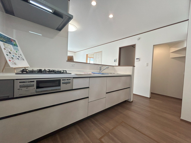 浄水機能付き、収納たっぷりなシステムキッチン!幅広で料理もしやすい♪3口のガスコンロを設置し、お掃除が手軽にできるタイプの換気扇を設置しています♪キッチンの配置にもこだわりました♪