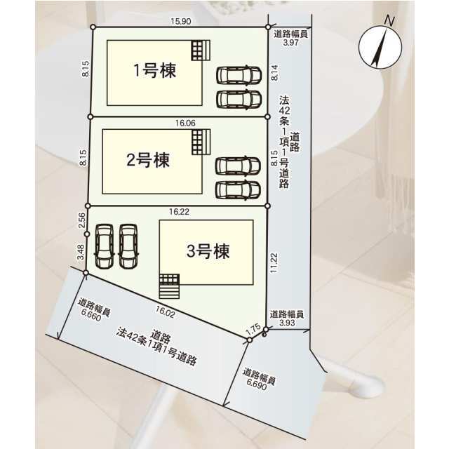 - 1号棟 東:4m 2号棟 東:4m 3号棟 東:4m 南:6.6m