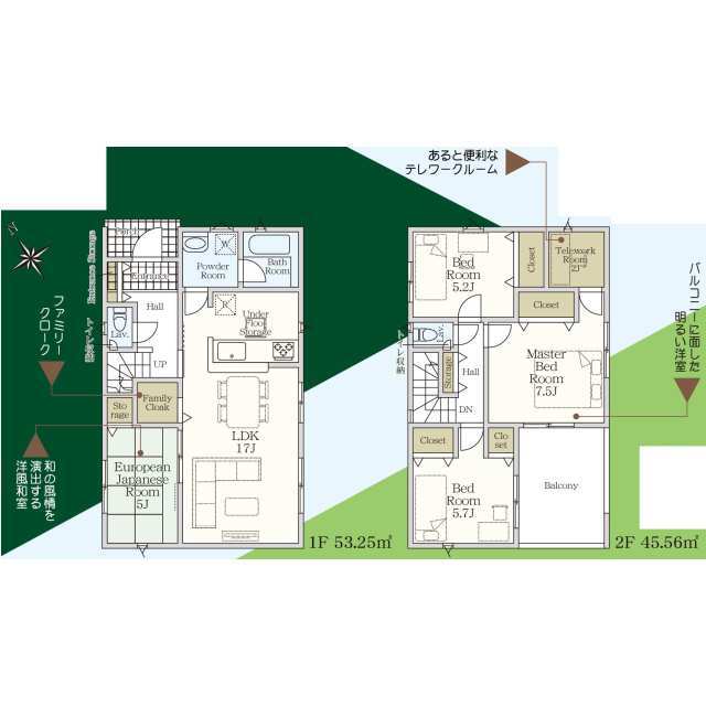 2階には広々としたバルコニーや、あると便利なテレワークルーム。