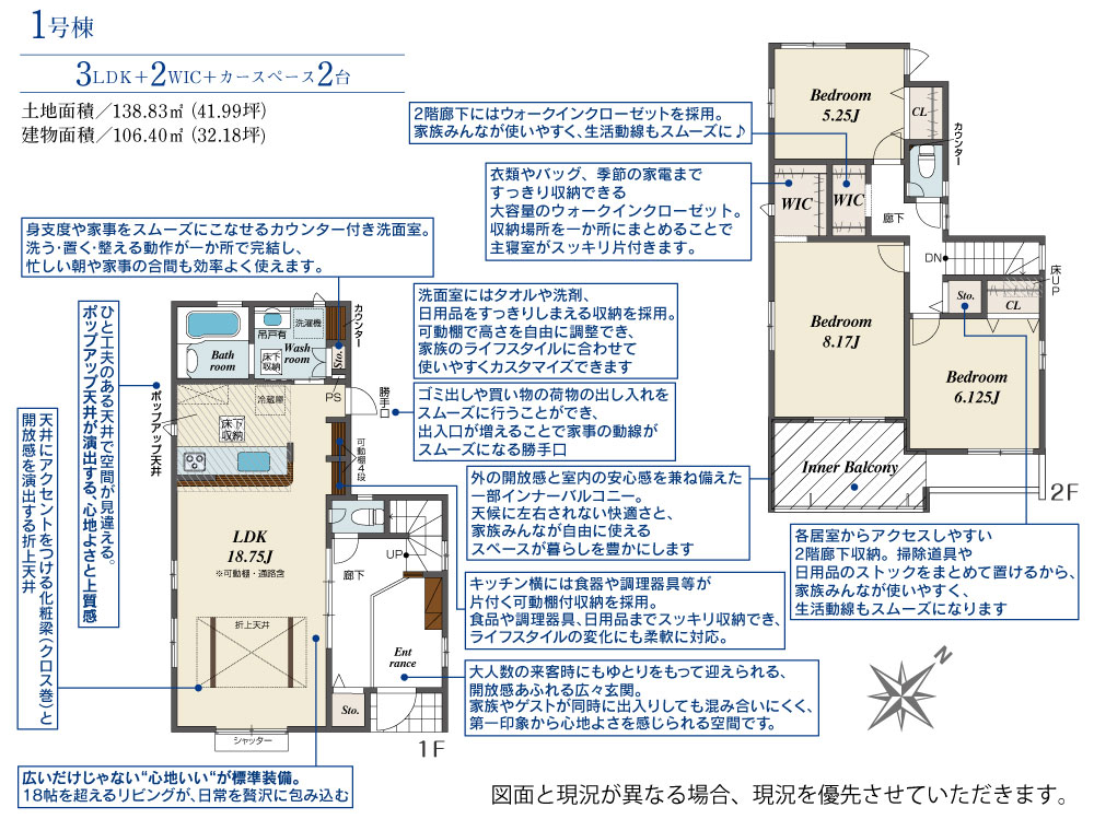 キッチン横や洗面、2階廊下WICなど様々な場所に収納を完備した使い勝手のいい間取り♪