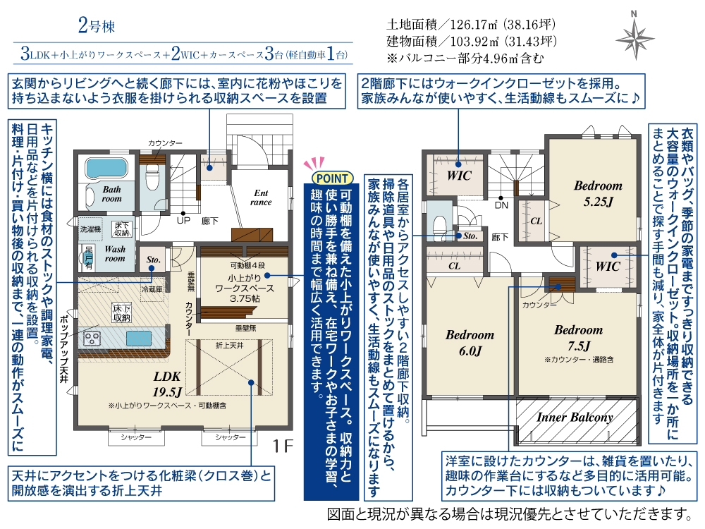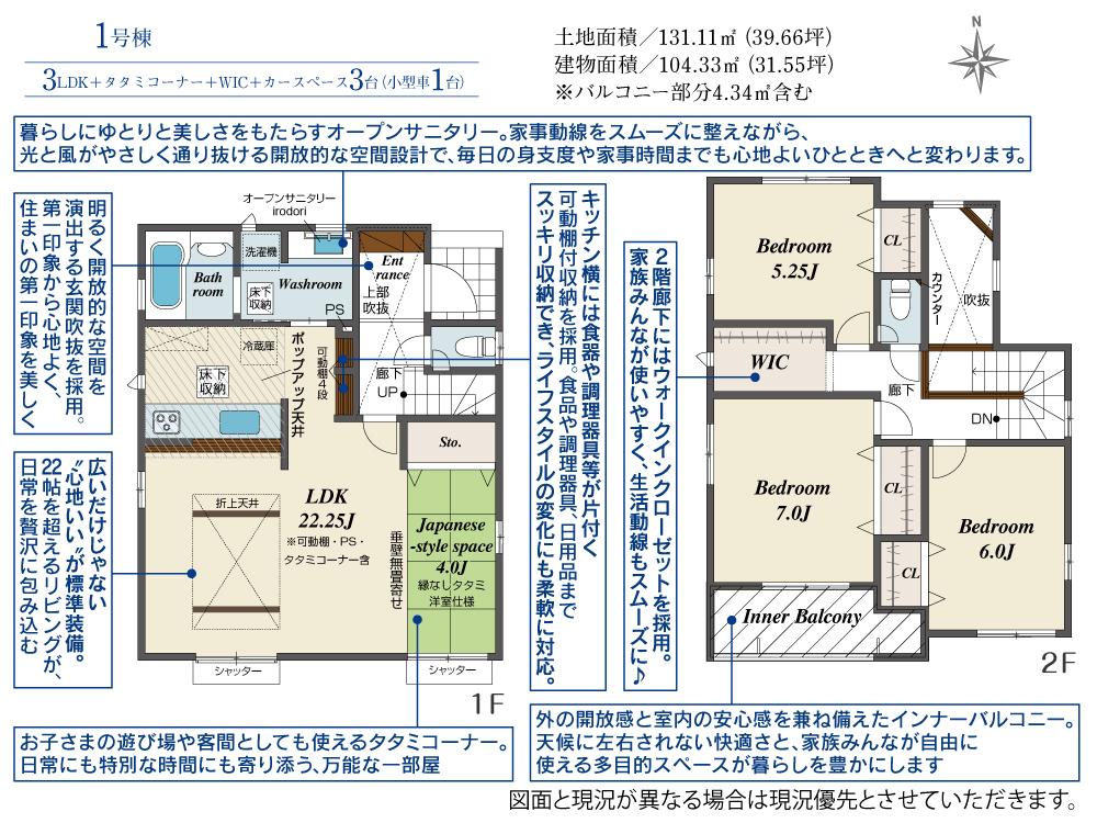 1号棟 3LDK+タタミコーナー+WIC+カースペース3台(小型車1台)