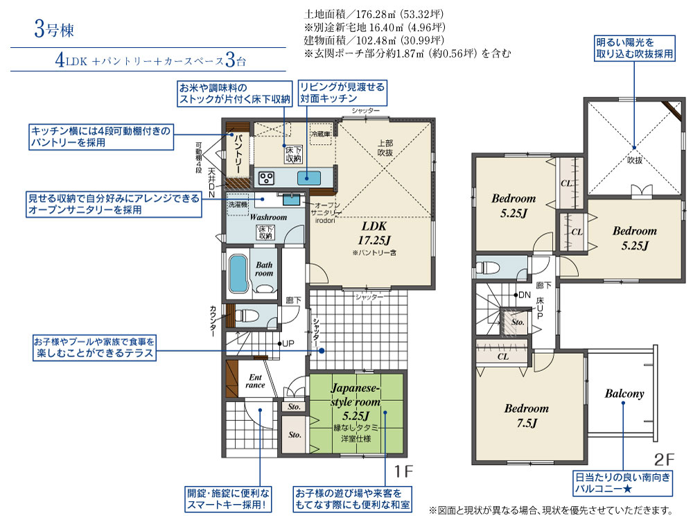 3号棟:和室で落ち着く空間♪LDK吹抜で広々空間と自然光が入ります♪
