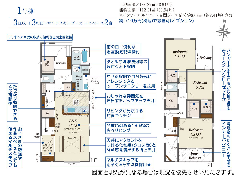 1号棟テレワークや勉強、趣味まで家族みんなで自由に使えるマルチスキップを採用♪土間収納・WIC・可動棚4段と豊富な収納でスッキリ快適な生活☆彡