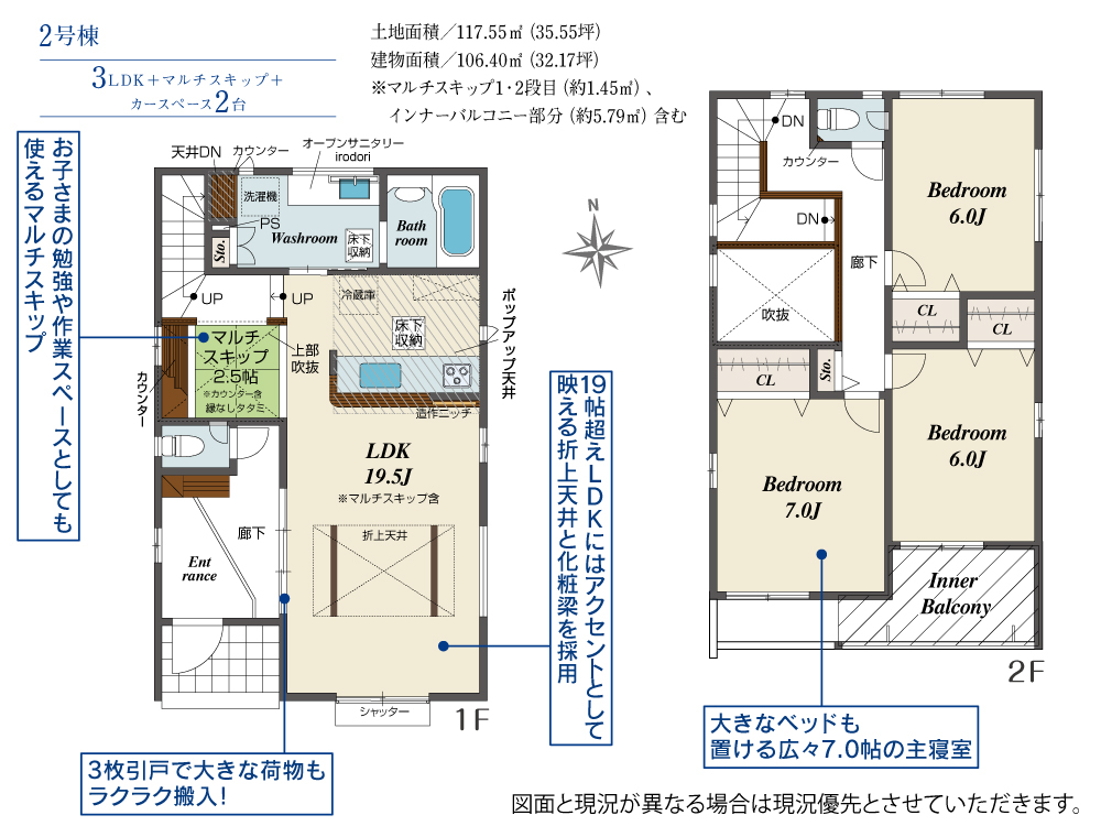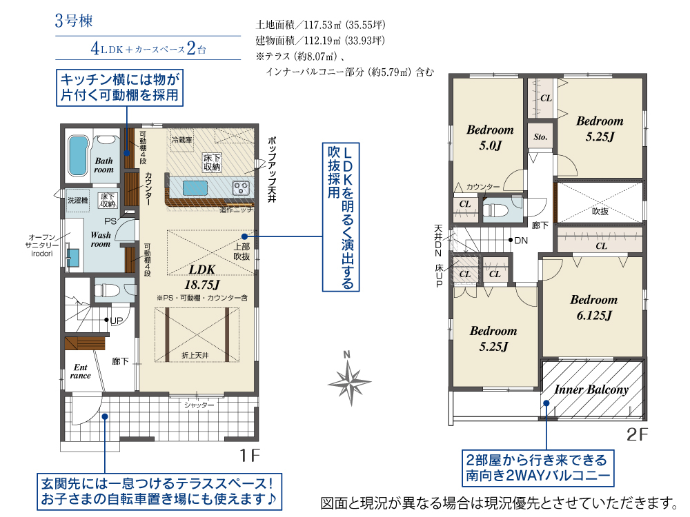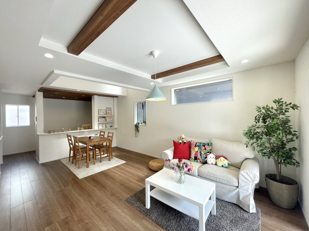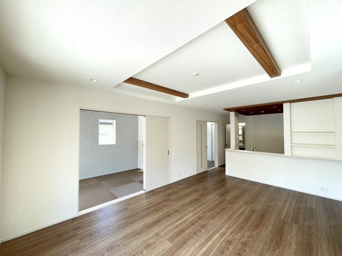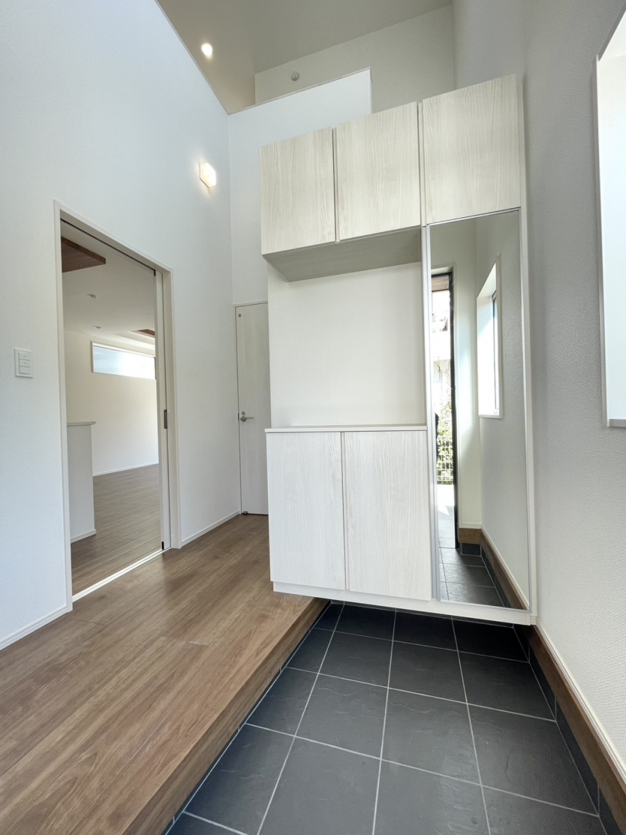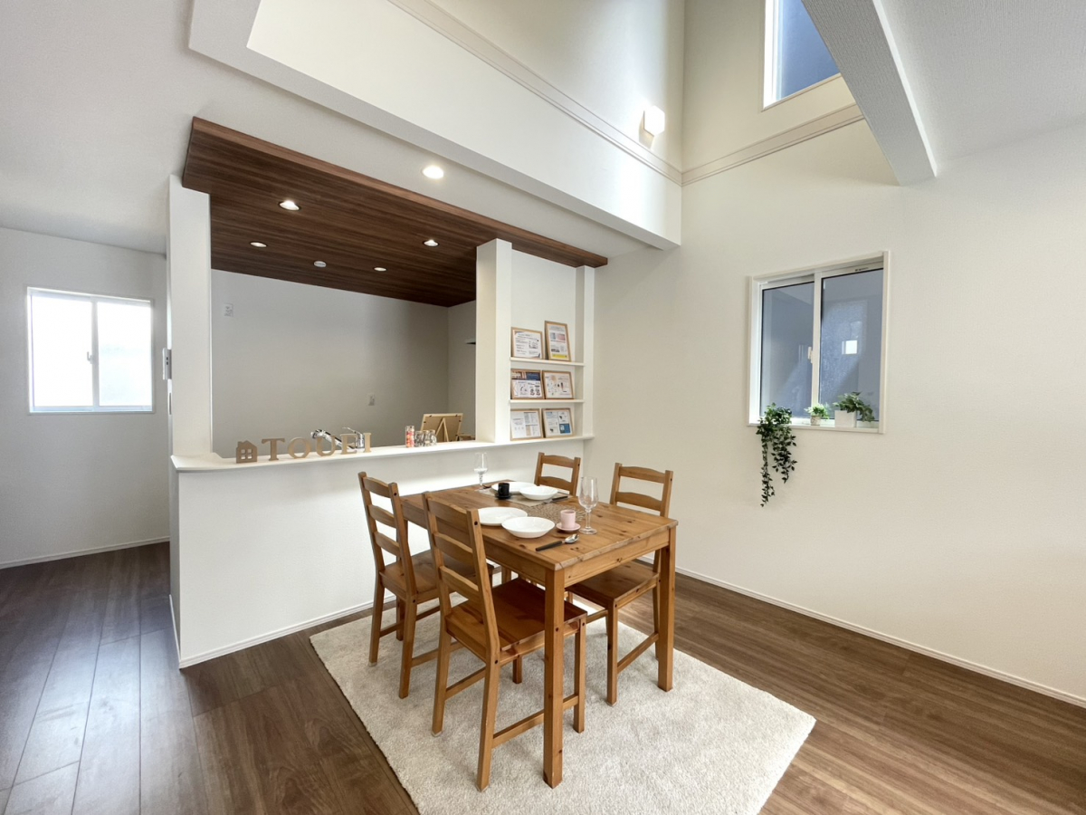 耐震、制震に優れた【ダンパー】採用!リビングが見渡せる【対面キッチン】1号棟、玄関を明るく演出する【上部吹き抜け】たっぷり収納の【クローゼット】を設置、来客時には客間にもなる【便利な和室】2階、【全