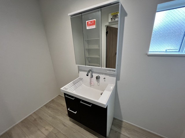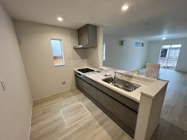 真っさら新築の物件、更にシステムキッチン設置済で一体感のあるデザインの台所です。自然に団らんが生まれる3LDK。是非見学にお越しください。