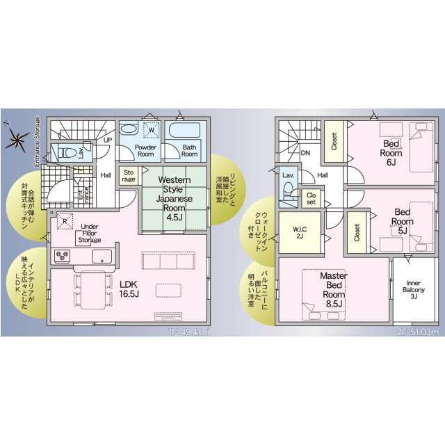 閑静な住宅街・LDK15.5帖・広々ルーフバルコニー 会話が弾む対面式キッチン。心安らぐ畳の部屋。 玄関収納や納戸など豊富な収納スペース。 あると便利な複数トイレ。