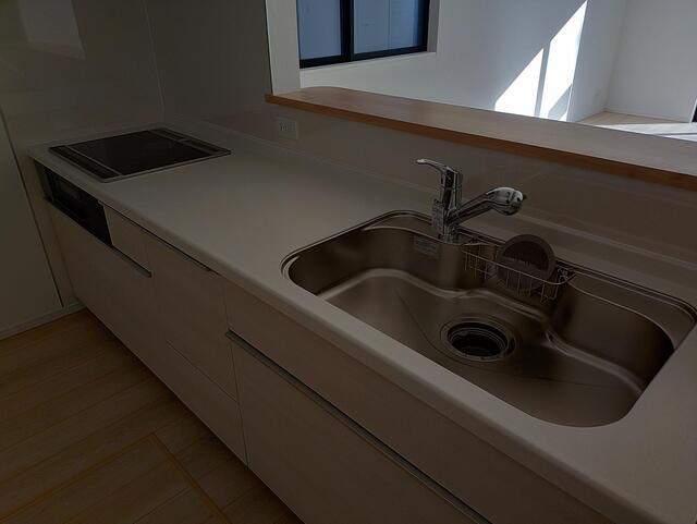 鏡面保護シールが初々しい新築の建物、更にコンロやシンクがセットされたシステムキッチン設置済で一体感のあるデザインの台所です。家族が帰宅を焦がれる2LDK。