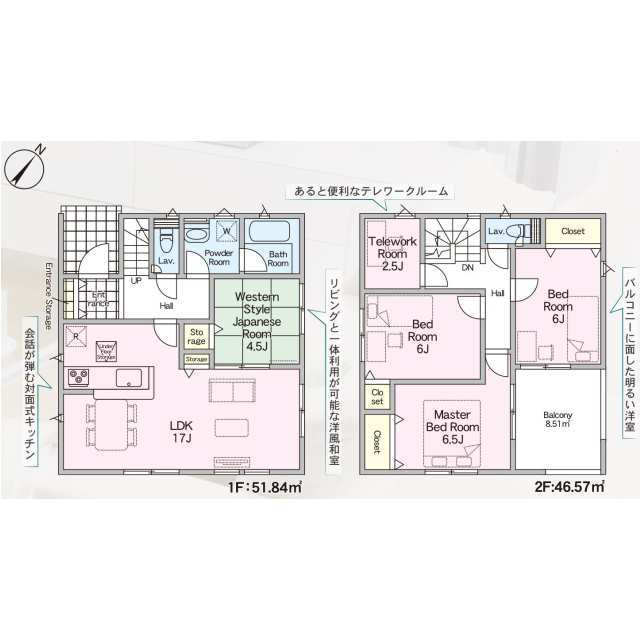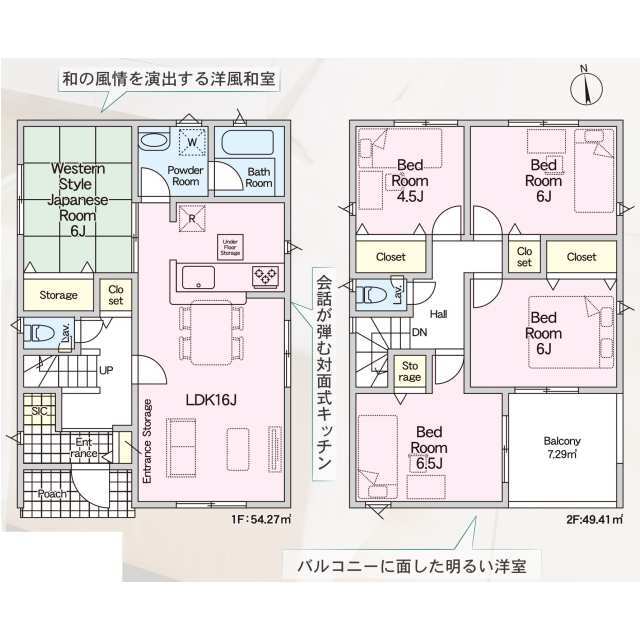 閑静な住宅街・全棟LDK16帖以上・全棟主寝室8帖以上 会話が弾む対面式キッチン。心安らぐ畳の部屋。 整理整頓しやすい豊富な収納スペース。防犯対策に心強い防犯カメラ。