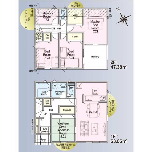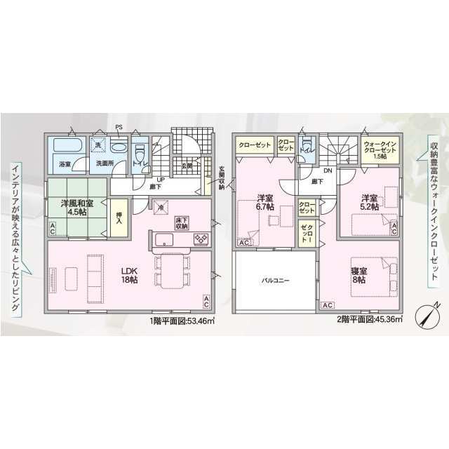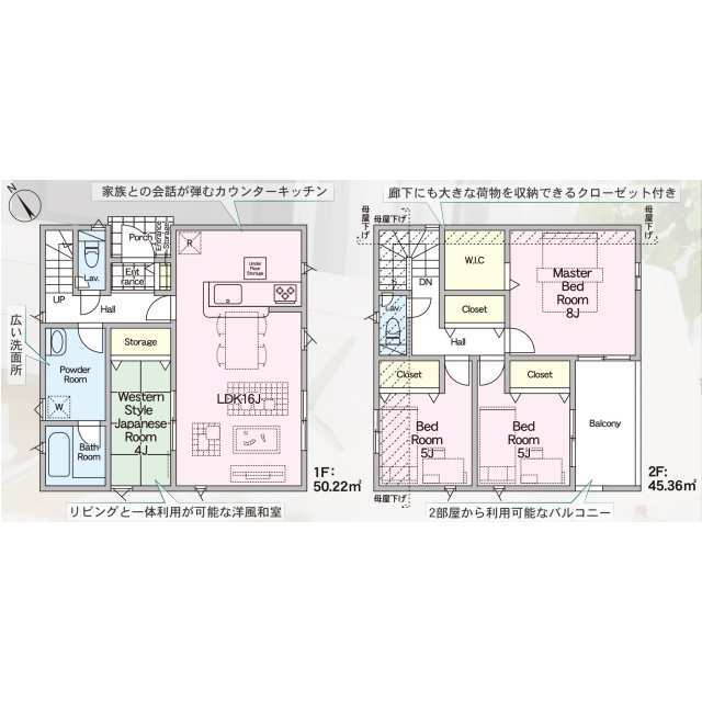 全棟LDK16帖以上、主寝室7帖以上。 会話が弾む対面式キッチン。 喚起暖房乾燥機付きユニットバス。 TVモニター付インターホンや防犯対策に心強い防犯カメラ完備。