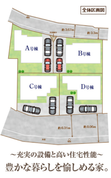 選べる新築住宅と建築条件付売地。 北6m・西6mの開放的な公道に面したゆとり溢れる4家族の街が誕生しました。
