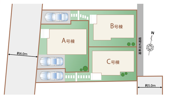 南西6m、北西5m、分譲地内4.5mの開放感ある18家族の街♪ 近隣に買い物施設も揃った、利便性に優れた暮らしやすいロケーションです。